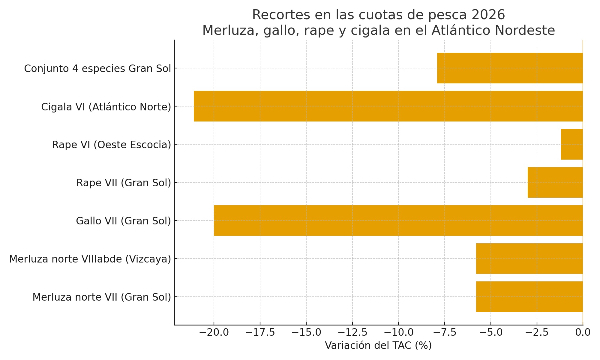 Uno de los golpes más duros llega con el gallo en la zona VII, el principal caladero para la flota del norte español. El acuerdo fija un TAC de 16.024 toneladas, lo que supone un descenso del 20 % respecto al nivel anterior. Esta rebaja afecta de lleno a una pesquería que depende en gran medida de esta especie para cuadrar las mareas y mantener la rentabilidad de las faenas en Gran Sol.