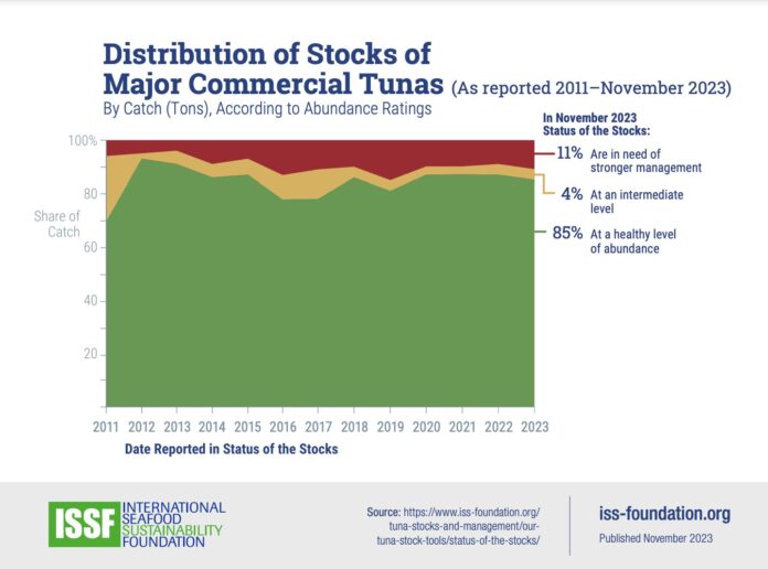 Del total de capturas comerciales de atún en todo el mundo, el 85% procede de poblaciones con niveles «saludables» de abundancia, según el último informe de la International Seafood Sustainability Foundation (ISSF) sobre el estado de las poblaciones. Las poblaciones sobreexplotadas representan el 11% de las capturas totales, y el 4% de las capturas proceden de poblaciones con un nivel intermedio de abundancia.