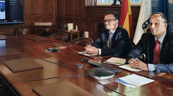 El presidente de la Autoridad Portuaria de Vigo, Carlos Botana, y el jefe del Departamento de Obras y Economía Azul, Gerardo González, participaron en un seminario online enmarcado en el Eje Estratégico de Puertos del Plan de Acción del Atlántico, coordinado por la Autoridad Portuaria de Vigo.