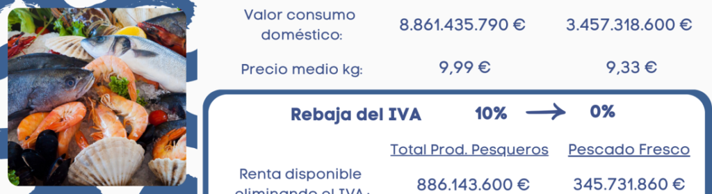 El impacto en las arcas del estado de eliminar el IVA de los productos pesquero sería en torno a 886 millones de euros, que podrían destinarse a dejar disponible este dinero para que los españoles pudieran adquirir casi 89 millones más de kilos de productos pesqueros al año, productos que la comunidad científica coinciden en señalar como básicos para llevar una dieta saludable.