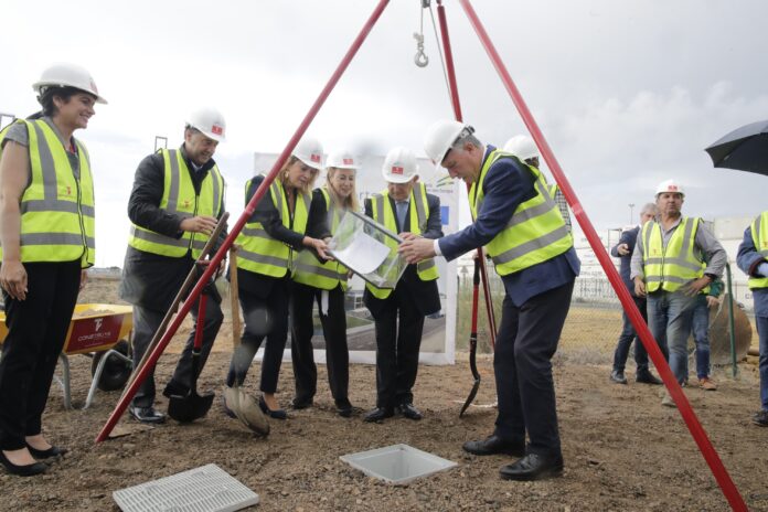 La consejera de Economía, Hacienda y Fondos Europeos de la Junta de Andalucía, Carolina España, acompañada por la presidenta del Puerto de Huelva, Pilar Miranda, el presidente de Frigoríficos Portuarios del Sur SL (FRIPORTSUR), Jose Luis Vallines, el CEO de la empresa, Salvador Urbistondo, y el alcalde de Palos de la Frontera, Carmelo Romero, ha puesto hoy la primera piedra del Hub Logístico del Frío del Puerto de Huelva, un proyecto que comienza con las nuevas instalaciones logísticas para la conservación de mercancías a temperatura controlada, que la compañía FRIPORTSUR va a construir en el Puerto y para las que ha anunciado una inversión de 34 millones de euros.