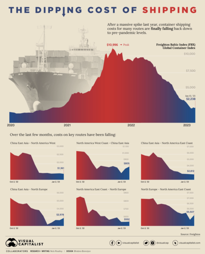 Hace poco más de un año, la congestión en los puertos de la costa oeste de Estados Unidos ocupaba los titulares y el costo global de los contenedores de transporte marítimo había alcanzado niveles récord. no obstante, Visual Capitalist asegura la caída de los fletes en el transporte marítimo a niveles pre pandemia.