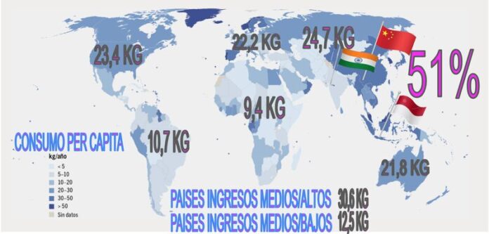 La producción pesquera mundial está aumentando, impulsada principalmente por la rápida expansión de la acuicultura en países asiáticos no pertenecientes a la OCDE, como China, India, Indonesia y Vietnam. En los países de la OCDE, por el contrario, observamos un crecimiento más lento de la acuicultura y una disminución constante del empleo en la pesca, a pesar de una mayor estabilidad del valor económico generado.