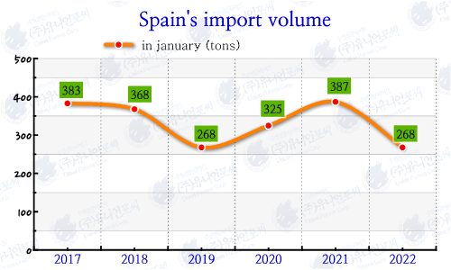 De 2017 a 2022, el volumen medio de importación desde España en enero fue de 333 toneladas, el más alto en 2021 y el más bajo en este año y 2019. En enero de 2022 se importaron desde España un total de 268 toneladas de pescado, con 98.158 toneladas de importaciones de todos los países, de las que España supuso el 0,3%.