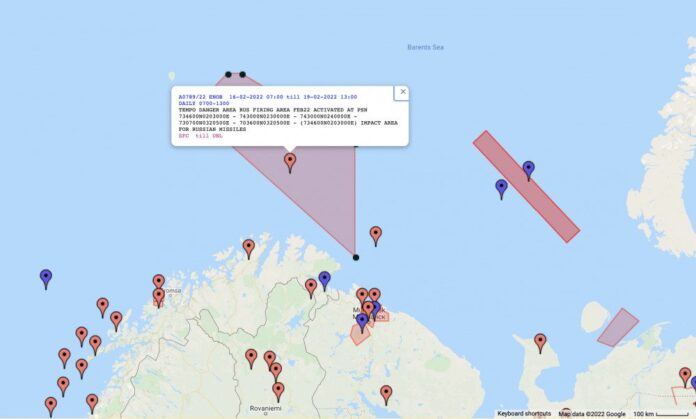 El aviso de zona de peligro se ha establecido para el periodo del 16 al 19 de febrero, diariamente entre las 7 de la mañana y la 1 de la tarde vease en la Captura de pantalla de notaminfo.com vía The Independent Barents Observer).
