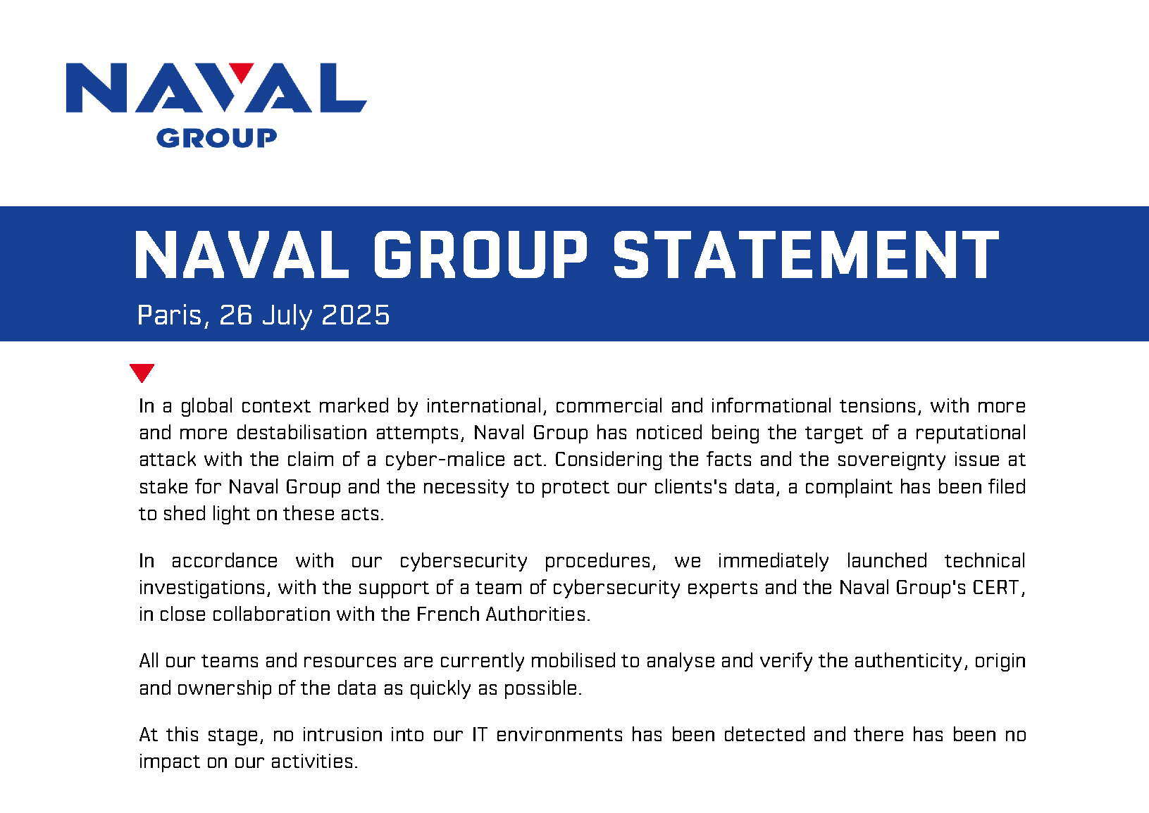 El ataque se habría producido días antes, cuando los piratas lanzaron un ultimátum de 72 horas exigiendo que Naval Group estableciera contacto a través de un canal de mensajería cifrada. La empresa no respondió al requerimiento y, de acuerdo con las declaraciones oficiales, no se ha solicitado ningún rescate económico, lo que hace suponer que el objetivo podría estar más vinculado al sabotaje o la exposición mediática que al beneficio económico directo.