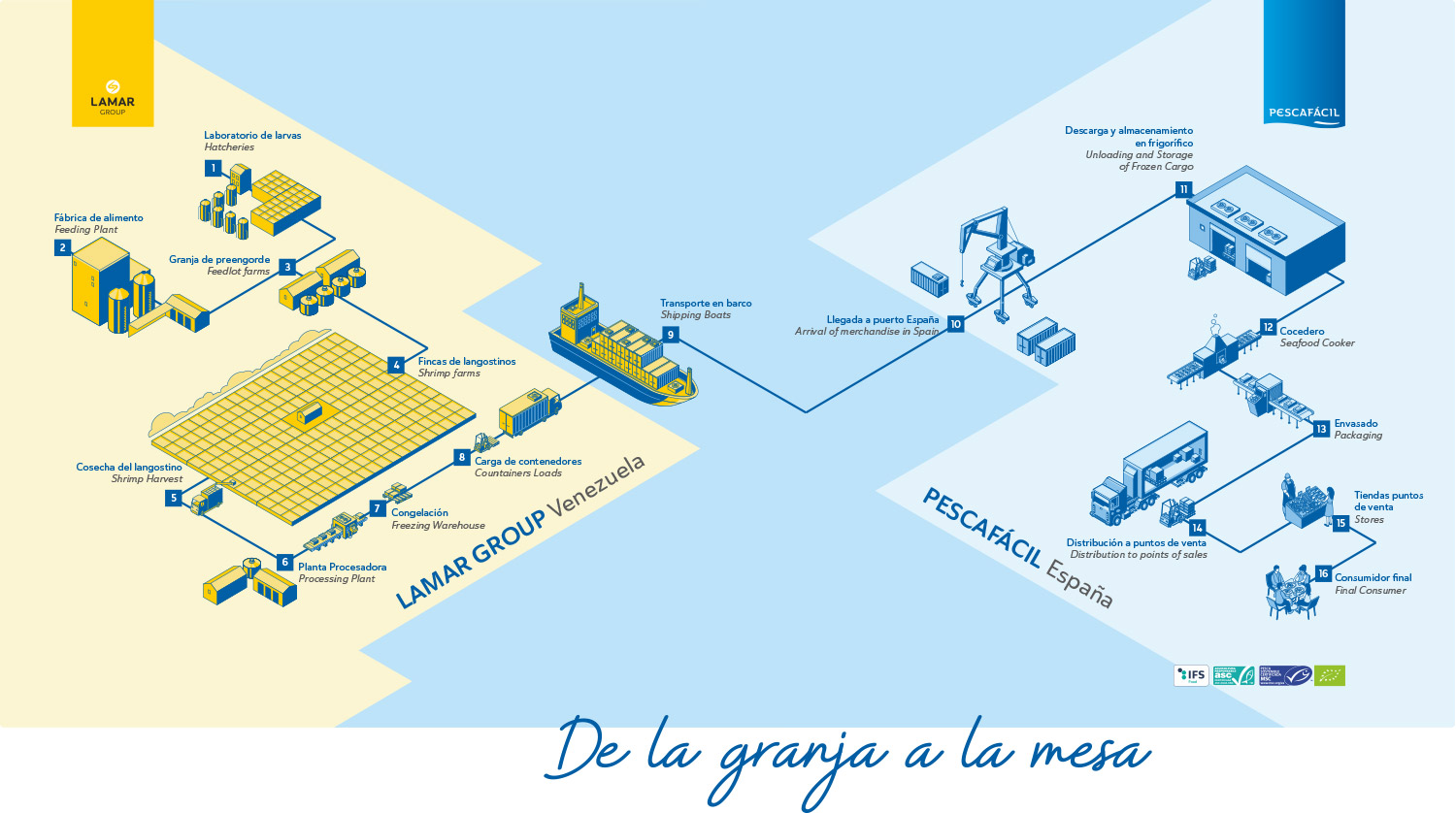 El desembarco de Lamar en Pescafacil se remonta a 2018, cuando el grupo venezolano —hoy responsable de buena parte de la producción camaronera de ese país— tomó una participación relevante en el capital, y el abogado y empresario venezolano Luis Comella se instaló en Burgos para asumir la presidencia del recién creado consejo de administración. La operación permitió a Lamar asegurar un pie industrial en Europa para su producto y a Pescafacil consolidar un suministro estable de materia prima. Desde entonces, la compañía burgalesa ha modernizado sus instalaciones, hasta contar con uno de los cocederos más avanzados del país, y ha apostado por la sostenibilidad, sustituyendo, por ejemplo, bandejas de plástico EPS por envases MAP de cartón reciclable.